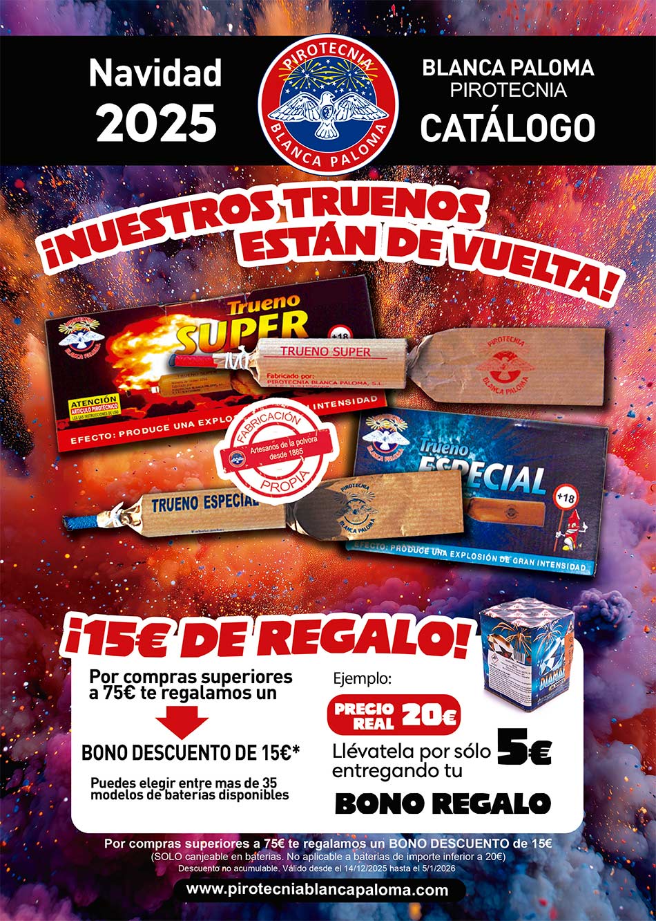 La legislación vigente prohíbe el envío de material pirotécnico por correo o mensajería. Todos los pedidos se recogerán en tienda.