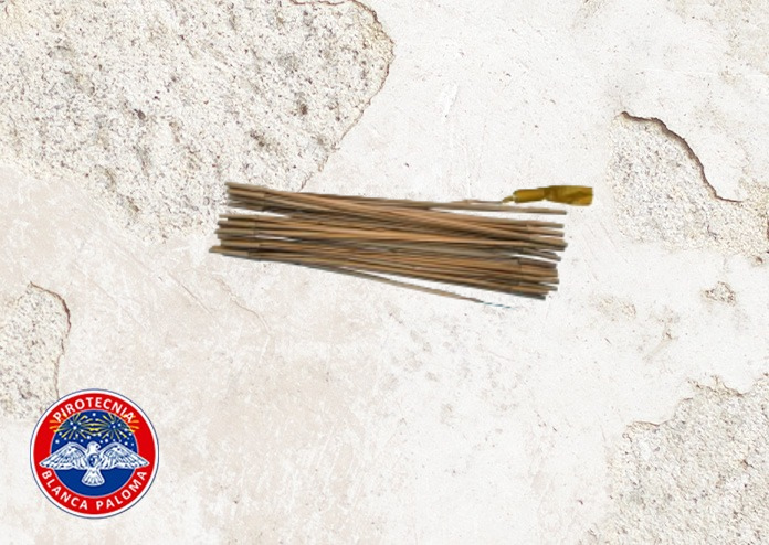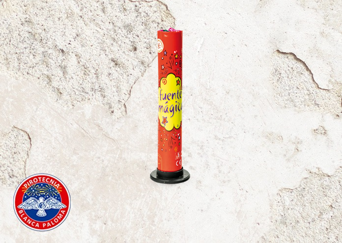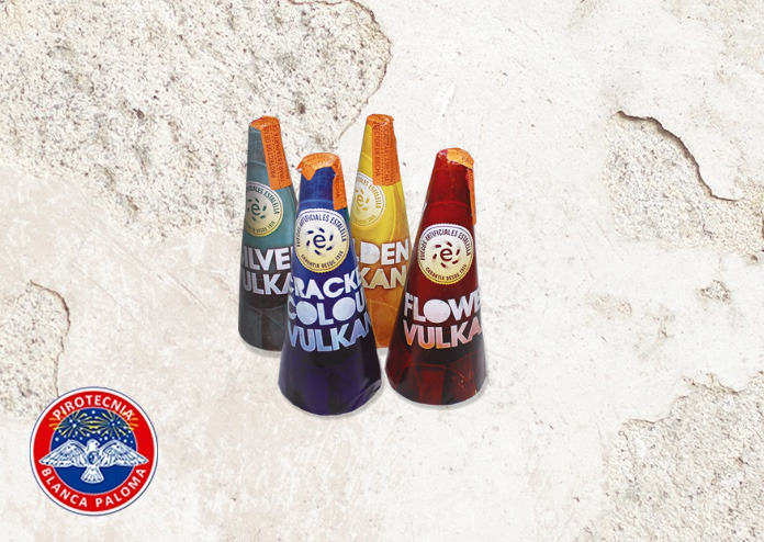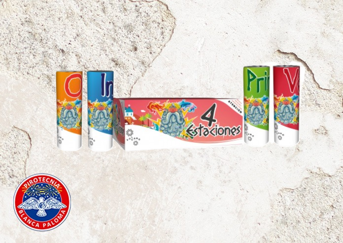 Efecto: Batería de troncos de colores con explosión de peonias multicolores intermitentes con aspas y centro coco.